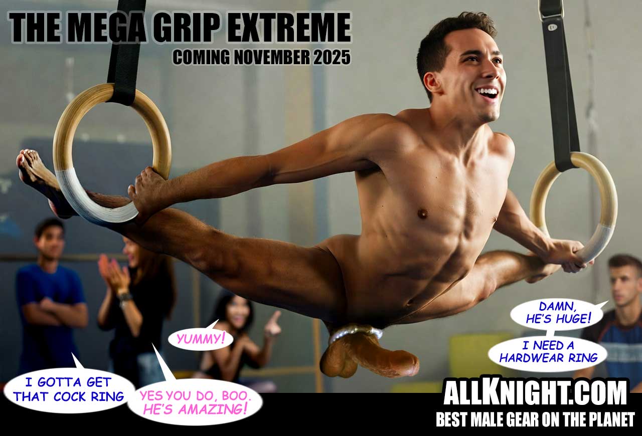 When the fit is right, the grip tight, and the anatomical pressure points and hot buttons pressed to perfection—then you'll enter the zone of cock ring stud nirvana. It’s plain to see by the look on Cody's face, not to mention the heft of his rod. Now, unless you've had years of training, you might not be able to do a buck-naked split while suspending yourself from the gymnastics rings. But, with the MEGA Hard, MEGA Large erections Hardwear rings produce, you’ll be a naked gymnast in the bedroom tonight for sure. Slip on a