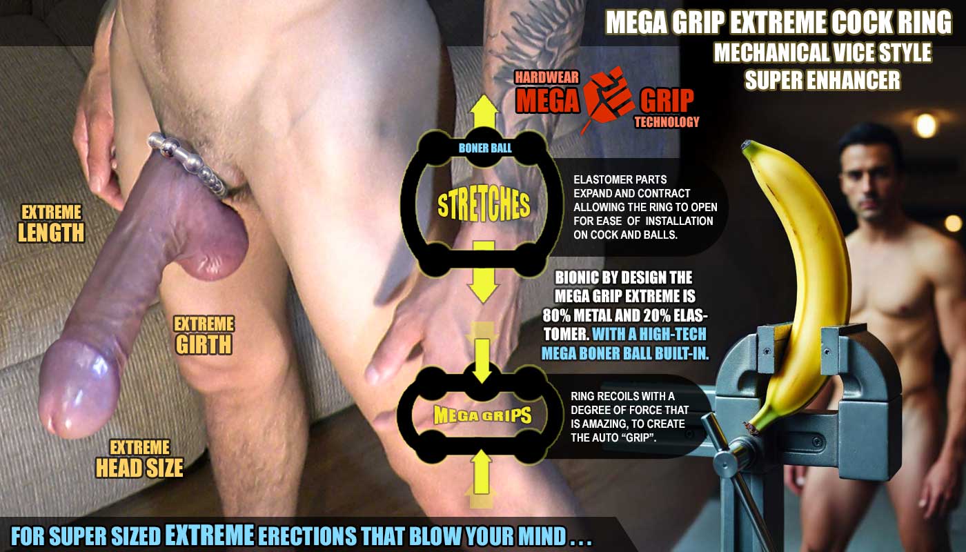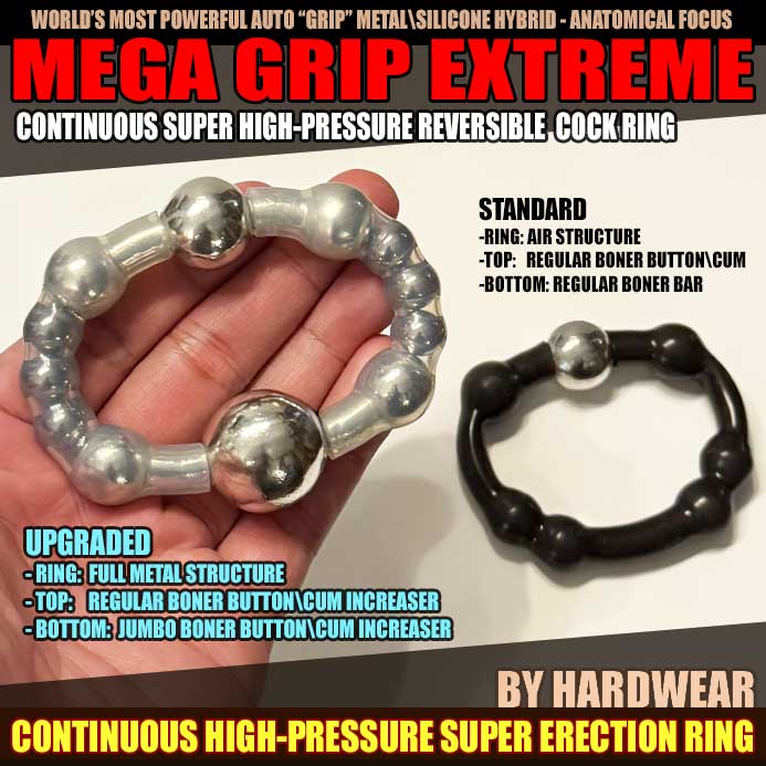 This is the mechanical vice style enhancement offered by the Mega Grip Extreme Cock Ring, an ideal technology with regard to constricting key areas of blood outflow in the erection with unmatched gripping force, automatically adjusting itself to changes in erection quality (EQ) by shrinking to “chase” maximum enhancement if the hardness of your penis starts to reduce, and by expanding as the pressure produces a super engorged super-sized extreme erection.